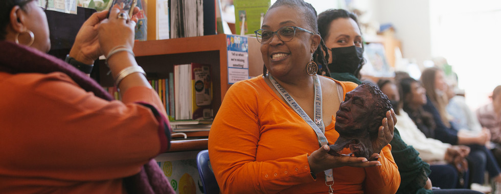 Kwame read An American Story to the students - a powerful picture book that tells the story of American slavery through the voice of a teacher struggling to help her students understand. Dare brought sculptures that she made for the artwork in the book and passed them around for the kids to examine.